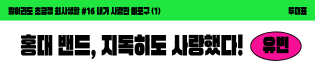 오늘은 저의 특별편입니다. 별다른 이유는 없고요. 그냥 둘이서 서로에게 휴가를 주기로 했습니다. 쓰고 싶은 말을 하면서요. 다음 주에는 정수 대표의 차례입니다. 저는 제가 사랑했던 홍대 밴드 씬에 대해 씁니다.